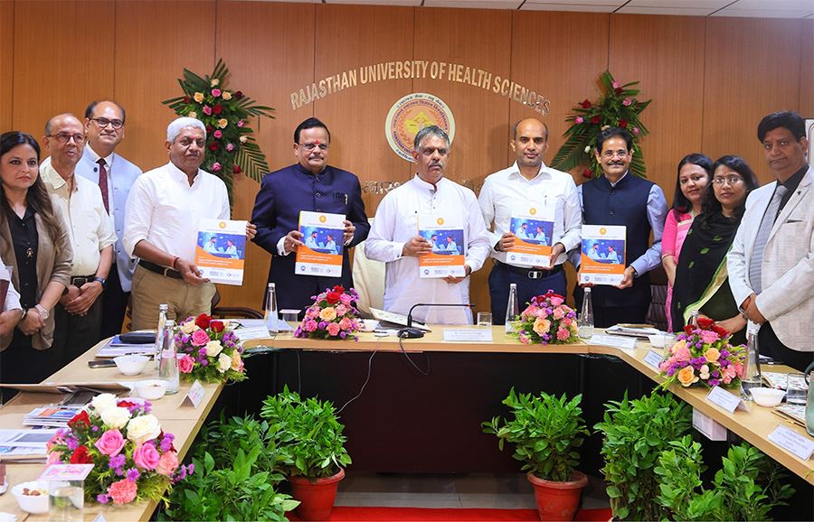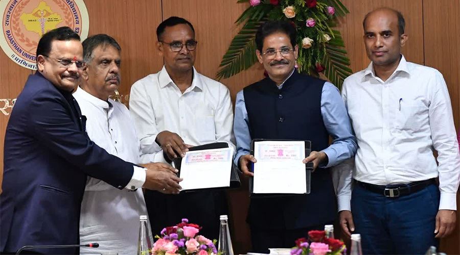 The signing took place at RUHS, Jaipur, in the presence of Shri Gajendra Singh, Hon'ble Health Minister, Shri Amrish Kumar, Secretary, Medical Education and Prof. (Dr.) Pramod Yeole.
